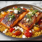 This 30-Minute Mediterranean Salmon recipe combines tender, perfectly cooked salmon with a vibrant mix of Mediterranean flavors including smoky paprika, fresh herbs, juicy cherry tomatoes, briny olives, and creamy feta. Prepared in one pan, it’s a healthy, delicious, and hassle-free meal, featuring a base of fragrant jasmine rice and protein-rich chickpeas for a wholesome dinner.