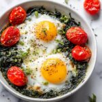 This Baked Feta Eggs with Tomatoes and Spinach is a flavorful and satisfying Mediterranean-inspired breakfast or brunch dish. It features roasted cherry tomatoes, bell peppers, onions, and garlic with creamy feta cheese, topped with fresh spinach and baked eggs. The dish is seasoned with oregano, thyme, and red pepper flakes for a balanced herbaceous and slightly spicy kick. Perfect for a nutritious and comforting meal, served warm with your favorite bread for dipping.