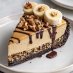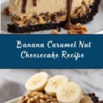 A decadent Banana Caramel Nut Cheesecake featuring a buttery graham cracker crust, creamy banana-infused filling, and a luscious caramel nut topping. This classic American dessert is perfect for holidays or special occasions, combining smooth cream cheese and ripe bananas baked to perfection and crowned with rich caramel sauce and crunchy nuts.