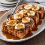 Bananas Foster French Toast with Homemade Banana Bread is a decadent twist on classic French toast. Thick slices of rich, moist banana bread are soaked in a spiced custard, pan-fried until golden, and topped with a buttery caramelized banana sauce infused with rum and brown sugar. This indulgent breakfast or brunch dish tastes like dessert on a plate, combining the sweetness of bananas with warm spices and a luxurious caramel sauce.