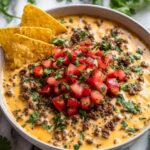 This rich and creamy Beef Queso Dip combines perfectly seasoned ground beef with a blend of melted cheeses and spicy diced tomatoes with green chilies. A Tex-Mex favorite, it’s ideal for parties and gatherings served warm alongside tortilla chips, veggies, or nachos.