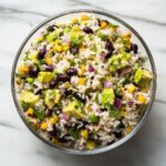 In a large bowl, combine the diced avocado, black beans, corn, chopped red onion, and cilantro. Then, add the cooled rice and pour the dressing over everything. Gently toss to ensure every ingredient is coated with that delicious dressing without mashing the avocado.