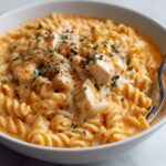 A creamy and spicy Buffalo Chicken Pasta recipe featuring tender chicken thighs, rotini pasta, and a rich Buffalo-style sauce made with hot sauce, heavy cream, and a splash of beer. Topped with blue cheese and fresh celery for a classic Buffalo wing flavor in a comforting pasta dish.