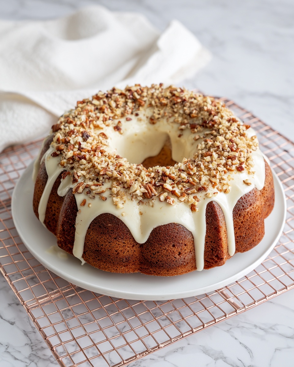 Allow your cake to cool in the pan for 10 to 15 minutes before releasing it onto a wire rack to cool completely. If you’re using the optional glaze, whisk powdered sugar, milk or creamer, and vanilla together until smooth, then drizzle it over the cooled cake for a sweet, glossy finish that makes every slice irresistible.