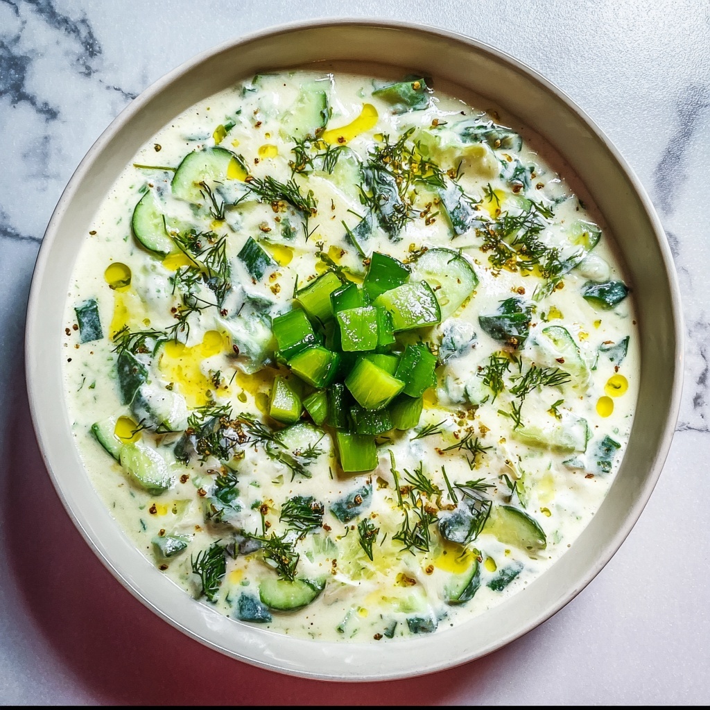 Cacık is a refreshing Turkish yogurt cucumber dish that can be enjoyed as a cold soup, side dish, or dip. Made with thick yogurt, finely diced or grated cucumber, garlic, fresh herbs, and olive oil, it offers a cool and flavorful way to complement many meals. This recipe is quick to prepare with no cooking involved, perfect for a light and healthy appetizer or snack.