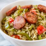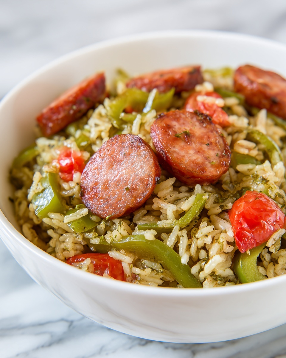 Reheat frozen or refrigerated leftovers in a covered skillet over low heat, adding a splash of chicken broth or water if the rice feels dry. Heating gently helps keep the rice fluffy and the sausage tender without drying out or burning the spices.