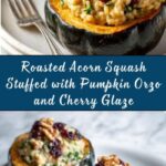 - Stuff Squash: Turn the roasted acorn squash halves cut side up. Spoon the warm pumpkin orzo filling evenly into each cavity, mounding the mixture slightly to fill the space.
