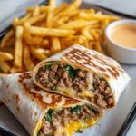 These Cheesy Beef Burritos with Fries combine seasoned ground beef, melted cheddar and Monterey Jack cheese, and crispy French fries wrapped in warm flour tortillas. A perfect blend of savory, cheesy, and crispy flavors that makes a satisfying main course suitable for family meals or casual gatherings.