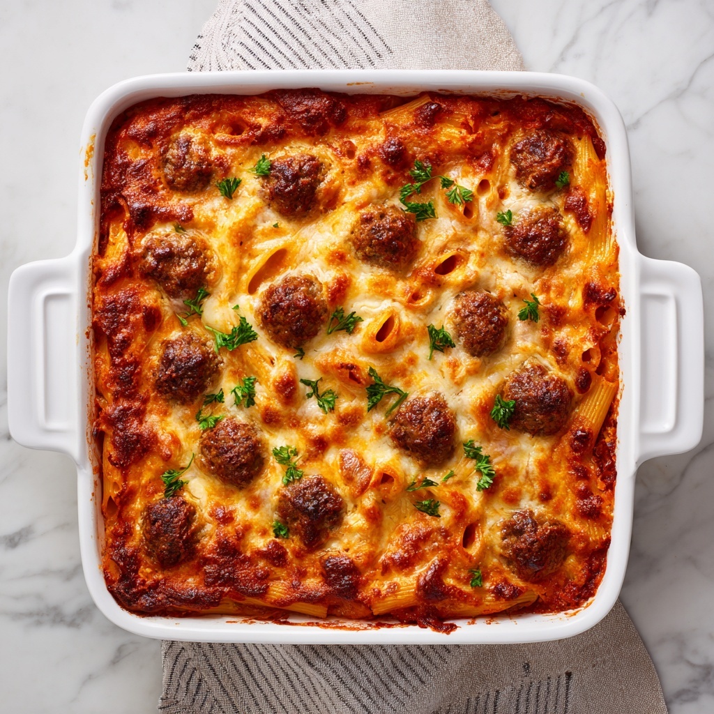 A hearty and comforting Cheesy Meatball Pasta Bake combining tender meatballs, perfectly cooked pasta, and a rich blend of mozzarella, cheddar, and Parmesan cheeses baked to bubbly, golden perfection. This dish is perfect for family dinners and serves 8 generously.
