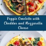 - Add the cheese and veggies: When the eggs are nearly cooked through but still slightly runny on top, sprinkle the shredded cheddar and mozzarella evenly over one half of the omelette. Spoon the sautéed vegetables on top of the cheese.