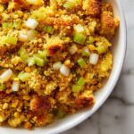 This Cornbread Stuffing with Apples recipe is a flavorful and comforting holiday side dish, perfect for Thanksgiving or any occasion. Made with cubed cornbread, fragrant herbs, sautéed onion, celery, and crisp apples, it offers a delightful balance of savory and sweet. Moistened with broth and eggs, then baked until golden and crisp on top, this vegetarian stuffing brings texture and warmth to your table.