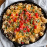 Transfer the beef and soup mixture into a 9×13-inch baking dish, spreading it out evenly. This creates a solid flavorful base. Then carefully arrange the frozen tater tots in a single layer on top of the meat mixture. The tots will bake into a crispy golden crust, adding fantastic texture contrast.