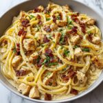 Return the drained pasta to the pan with the crispy bacon and tender chicken. Pour the silky egg and Parmesan sauce over the warm pasta and stir quickly but gently to coat everything evenly. If the sauce feels too thick, add a little more reserved pasta water, just until you reach that luscious creamy texture that makes this recipe so irresistible.