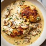 A delicious and creamy chicken dish featuring tender pan-fried chicken breasts smothered in a rich mushroom and Parmesan cream sauce, flavored with garlic and white wine. Perfectly paired with mashed potatoes or rice to soak up the luscious sauce.
