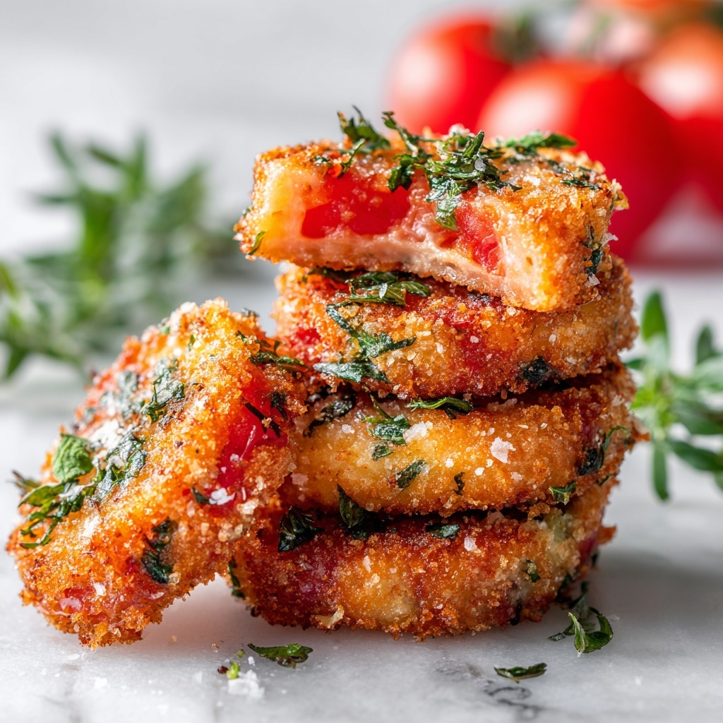 Deliciously crispy fried red tomatoes, coated in a savory Parmesan and cornmeal breading. This recipe offers two cooking methods: traditional oil frying for a classic golden crust, or air frying for a lighter, healthier alternative. Perfect as a flavorful appetizer or side dish, garnished with fresh basil for an extra burst of freshness.