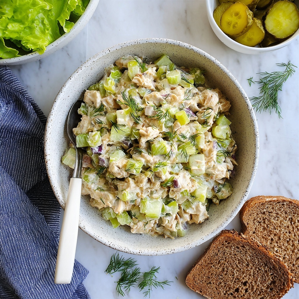 This Dill Pickle Chicken Salad is a tangy and creamy no-cook lunch option featuring shredded chicken breast mixed with chopped dill pickles, red onion, and fresh dill, all tossed in a zesty dressing made with mayonnaise, pickle juice, and Dijon mustard. It’s quick to prepare, packed with protein, and perfect served on bread, in wraps, or over greens.