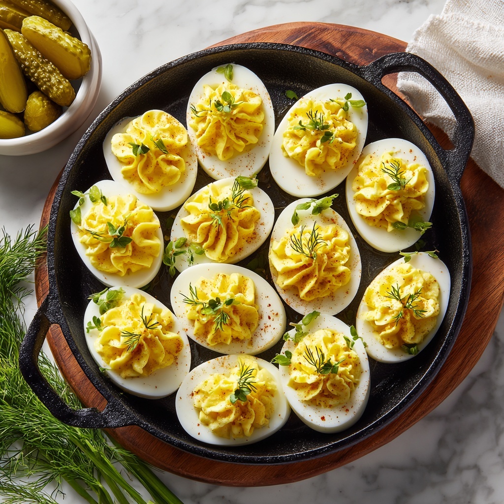 Sprinkle freshly chopped dill and a few diced dill pickles over each deviled egg for a fresh look and extra punch of pickle flavor. These garnishes not only enhance the taste but also make the dish visually inviting. Serve immediately for best flavor, or keep chilled until ready to impress your guests.