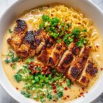 This Fiery Chicken Ramen with Creamy Garlic Sauce is a comforting and flavorful dish that combines tender, marinated chicken with spicy chili sauce and a luscious creamy garlic broth. Perfect for a quick weeknight dinner, it features instant ramen noodles simmered in rich chicken broth and heavy cream, garnished with fresh green onions for a bright finish.