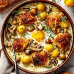 This classic French Chicken Casserole features tender, seared chicken thighs cooked in a rich and creamy mushroom and white wine sauce. Slow-baked to perfection, the dish is infused with fresh herbs and made luxurious by a hint of Dijon mustard and heavy cream. Perfect for a comforting family dinner serving six people.