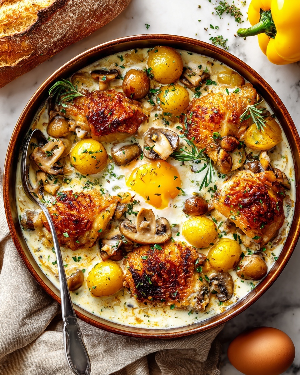 This classic French Chicken Casserole features tender, seared chicken thighs cooked in a rich and creamy mushroom and white wine sauce. Slow-baked to perfection, the dish is infused with fresh herbs and made luxurious by a hint of Dijon mustard and heavy cream. Perfect for a comforting family dinner serving six people.