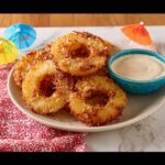 Fried Pina Colada Rings are a delicious tropical dessert featuring fresh pineapple rings coated in a crispy mixture of shredded coconut and panko breadcrumbs, then fried to golden perfection. These sweet and crunchy rings capture the classic flavors of pina colada in a fun and easy-to-make treat.