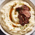 For an elegant dinner party, slice the steak thinly against the grain and fan it out over the mashed potatoes. Serve the garlic butter sauce on the side in a small pitcher so guests can drizzle to their liking. Adding a sprig of herb atop each plate keeps it festive and fresh-looking without any extra effort.