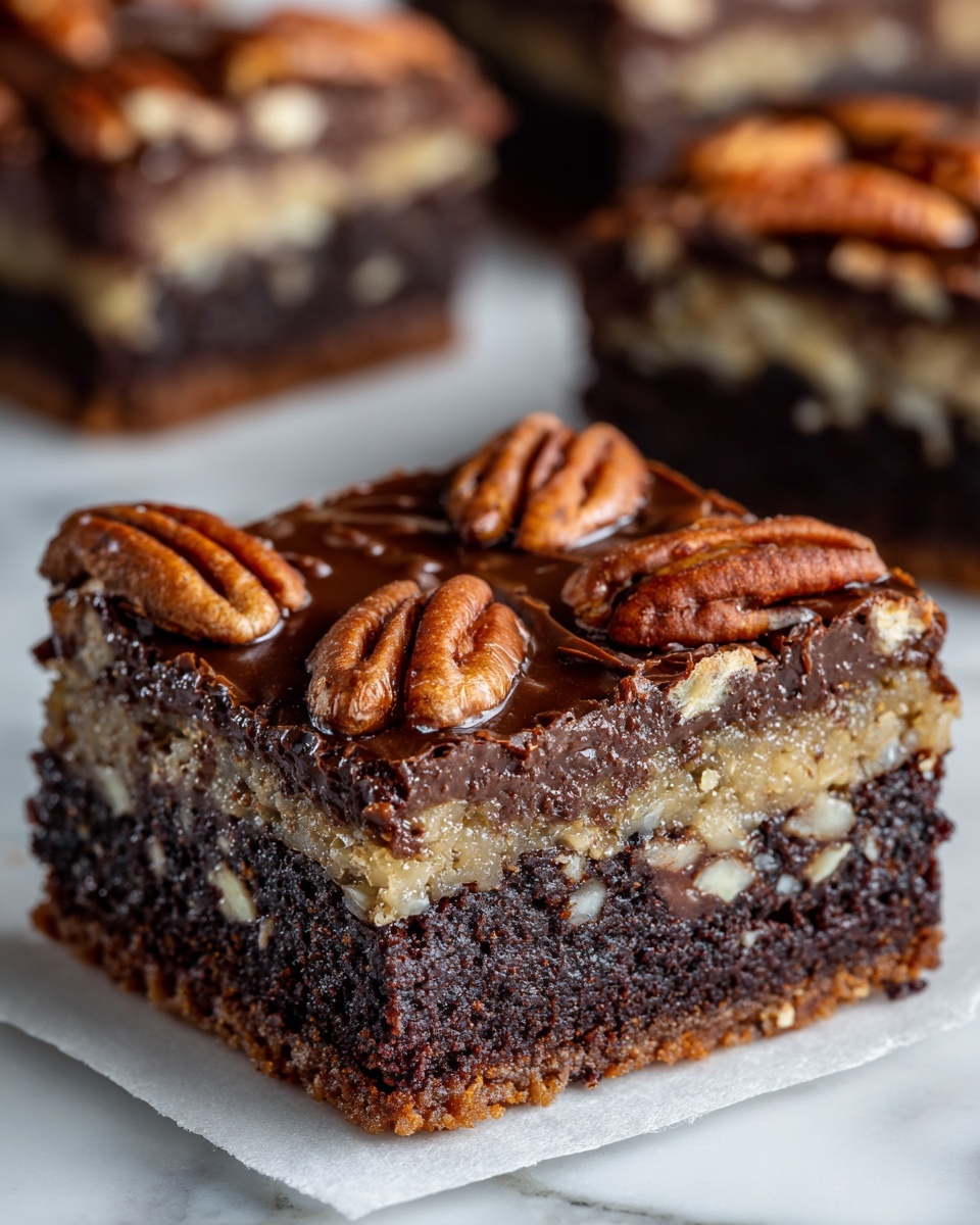 These Gooey Pecan Pie Brownies are a decadent dessert combining rich, fudgy chocolate brownies with a sticky, sweet pecan pie topping. The bottom layer is a classic chocolate brownie with a moist, tender crumb, while the top is a gooey, caramel-like pecan pie mixture packed with crunchy pecans. Baked together in one pan, they deliver the best of both worlds in every bite—perfect for potlucks, holidays, or any time you crave a luscious treat.