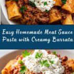 Grandma’s Meat Sauce Pasta with Burrata is a comforting Italian-American dish featuring a rich, homemade meat sauce simmered with ground beef, tomatoes, and aromatic herbs, served over perfectly cooked pasta and topped with creamy burrata cheese and fresh basil. This hearty main course combines deep flavors with a touch of freshness, making it a perfect dinner for family gatherings or cozy nights in.