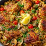 A flavorful Greek-inspired dish featuring tender, bone-in chicken thighs marinated with oregano and paprika, seared to golden perfection, and baked atop a zesty lemon-infused long-grain rice. This one-pan meal combines aromatic herbs, fresh lemon juice, and savory chicken broth for a deliciously comforting and vibrant dinner.