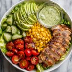 On the base of your choice—either fluffy cooked rice or protein-packed quinoa—layer black beans, grilled corn, halved cherry tomatoes, sautéed or grilled red bell peppers, chopped red onion, and beautifully sliced grilled chicken. Drizzle generously with the creamy avocado sauce and garnish with lime wedges and fresh cilantro to brighten the flavors and presentation.