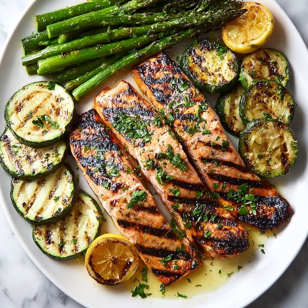 A quick and healthy grilled salmon and vegetables recipe featuring tender zucchini and asparagus, seasoned and cooked to perfection on the grill. This meal is perfect for a nutritious and flavorful dinner ready in just 25 minutes.