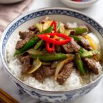 Gyudon, or Japanese Beef Rice Bowl, is a flavorful and comforting dish featuring thinly sliced beef simmered with onions in a savory-sweet dashi-based sauce. Served over steaming Japanese short-grain rice and garnished with pickled red ginger, this quick and easy recipe captures the essence of traditional Japanese home cooking in just 20 minutes.