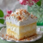 Spread the coconut pudding evenly over the cooled cake. Then, add a generous layer of whipped topping on top. Finally, shower the cake with sweetened shredded coconut to finish off that unmistakable tropical aesthetic and flavor.