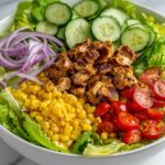 This step is where all the hard work comes together in a colorful bowl of fresh goodness. Begin with the packed greens as your base, then layer in the sliced red onion, halved cherry tomatoes, cucumber, creamy avocado slices, and sweet corn. Give everything a gentle toss with the reserved homemade ranch dressing to evenly coat those crisp veggies and fresh herbs. Finally, top your greens with the golden chicken pieces, and you have a salad that’s as stunning to look at as it is satisfying to eat.
