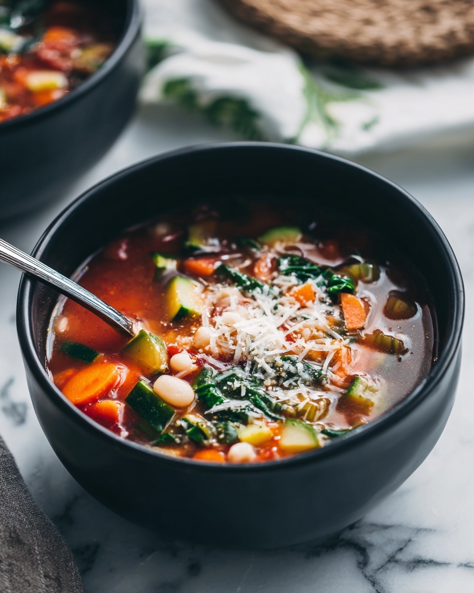 Ladle your Hearty Vegetable Minestrone Soup Recipe into bowls and generously top each with freshly grated Parmesan cheese. It adds a rich, salty finish that elevates every spoonful into a comforting delight.