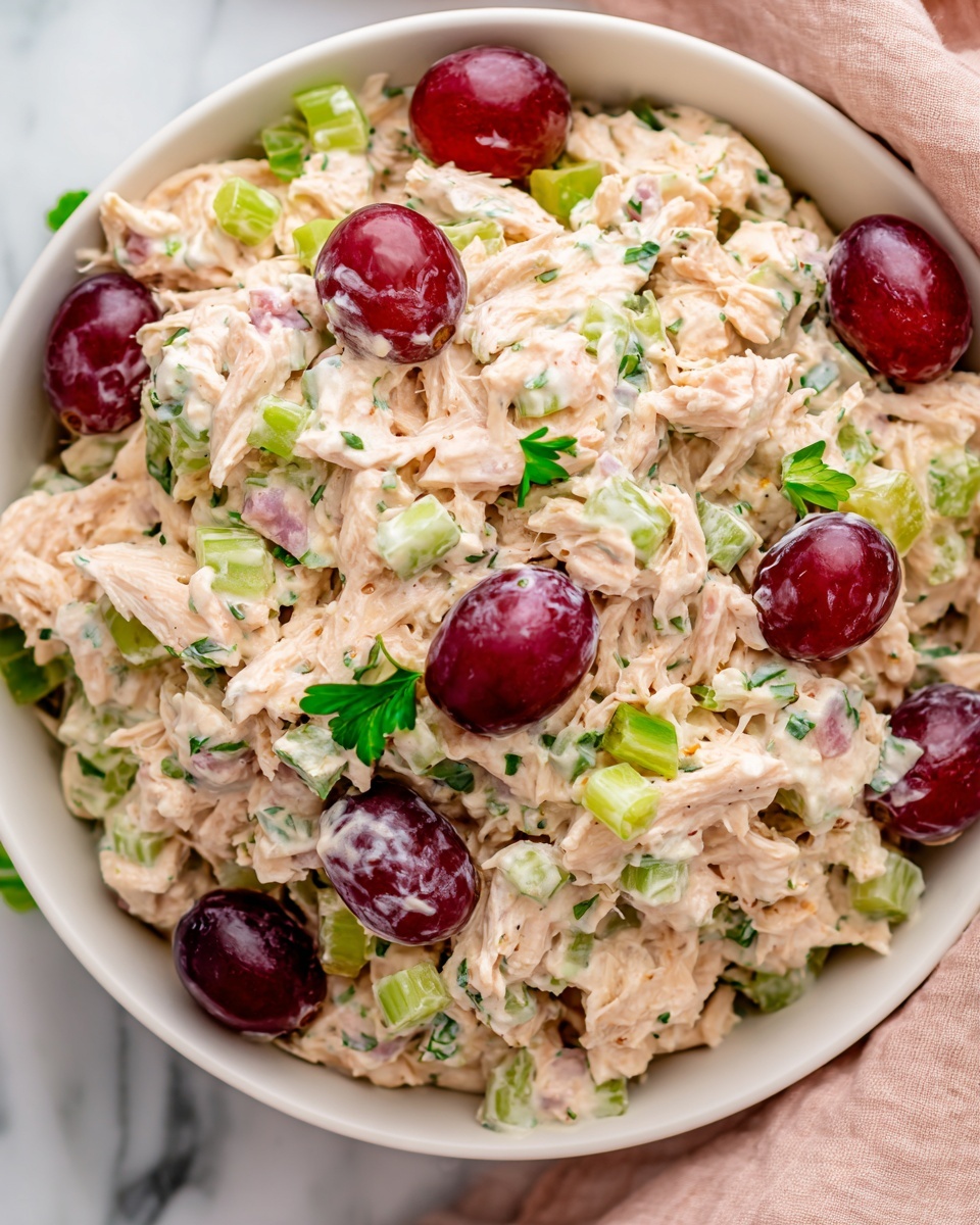 This High Protein Chicken Salad is a flavorful and nutritious dish featuring tender shredded chicken combined with a creamy cottage cheese and mayonnaise dressing. Enhanced with fresh grapes, celery, and zesty seasonings, it makes a perfect healthy lunch or light dinner that’s rich in protein and bursting with balanced flavors.