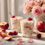 Carefully pour the shaken peach, pineapple, and coconut milk mixture over the ice and cherry syrup in the glasses. Add a few fresh peach slices and top each drink with one or two maraschino cherries. These garnishes not only boost visual appeal but also invite your guests to get tactile with their drink, making the experience even more delightful.