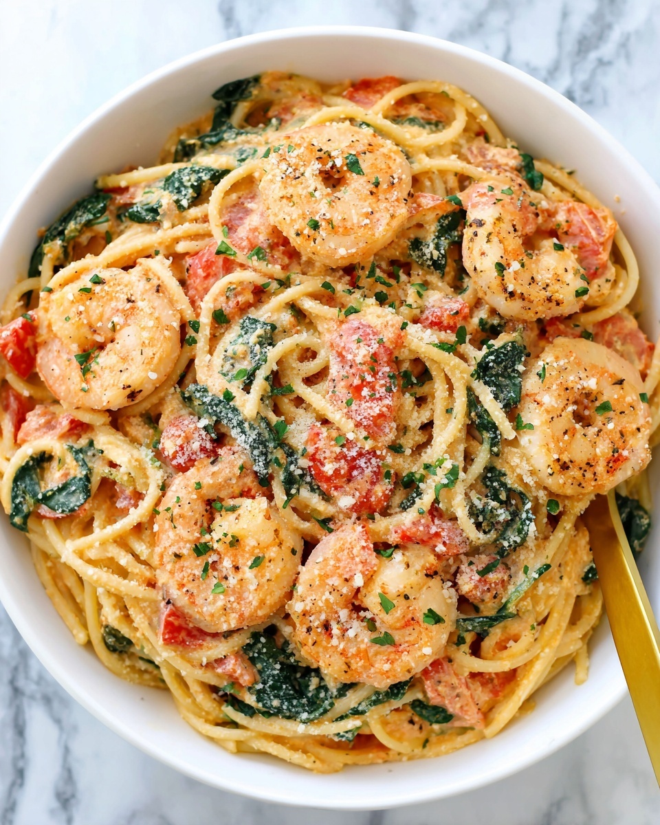 Finally, return the cooked shrimp to the pot along with the drained spaghetti. Toss everything together until every strand is coated in that creamy, spicy sauce. Stir in the baby spinach and let it wilt gently from the heat of the sauce—this adds a beautiful burst of green and a fresh taste to the dish.