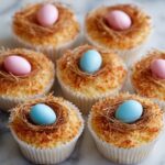 The green-tinted coconut “grass” creates an inviting Easter basket look, but feel free to get creative with your garnishes! Fresh berries, edible flowers, or even a drizzle of lemon glaze would add brightness and freshness, elevating your mini cheesecakes into elegant centerpieces for your dessert table.