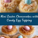 The green-tinted coconut “grass” creates an inviting Easter basket look, but feel free to get creative with your garnishes! Fresh berries, edible flowers, or even a drizzle of lemon glaze would add brightness and freshness, elevating your mini cheesecakes into elegant centerpieces for your dessert table.