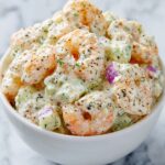 Place any leftover shrimp salad in an airtight container and refrigerate. It’s best enjoyed within two days to maintain the freshness of the shrimp and the bright flavors of the dressing.