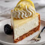 - Garnish and serve: Before serving, optionally garnish with additional lemon zest or thinly sliced lemon pieces for a fresh decorative touch. Serve the cheesecake chilled for the best flavor and texture.