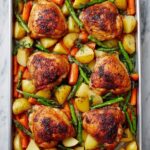 A flavorful and easy one-pan meal featuring herb-roasted chicken thighs with a colorful medley of baby potatoes, carrots, bell pepper, and red onion. This wholesome, gluten-free dish is perfect for weeknight dinners, requiring minimal prep and delivering deliciously tender and caramelized vegetables alongside juicy chicken.
