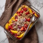 Start by preheating your oven to 350°F. In a large bowl, gently toss the sliced peaches and halved strawberries with granulated sugar, cornstarch, vanilla extract, and lemon juice. This process ensures every bite is bursting with balanced sweetness and just the right consistency after baking. Pour the mixture into a greased 8×8-inch baking dish, spreading evenly so every spoonful has a perfect fruit-to-topping ratio.