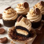 Delight in these rich and moist Peanut Butter Cup Cupcakes, featuring a decadent chocolate cake filled with a melty peanut butter cup surprise and topped with creamy peanut butter frosting. Perfect for chocolate and peanut butter lovers seeking a homemade indulgence with a delightful blend of flavors and textures.