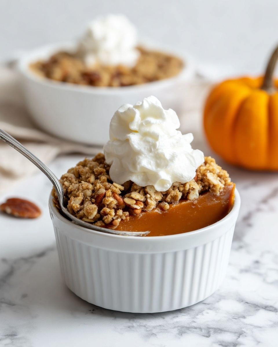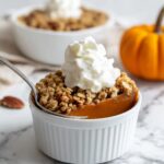 This Pumpkin Crisp is a warm and comforting dessert combining smooth spiced pumpkin filling with a crunchy oat and pecan topping. Baked to golden perfection, it’s an ideal fall treat that’s easy to prepare and perfect for family gatherings or cozy evenings.