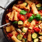 This Rigatoni with Sausage, Tomatoes, and Zucchini recipe is a flavorful and hearty Italian-inspired pasta dish perfect for a weeknight dinner. It features al dente rigatoni pasta tossed with a savory sausage and tomato sauce, accented by fresh zucchini and fragrant basil, then finished with a generous sprinkle of freshly grated parmesan cheese.
