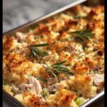Layer the shredded rotisserie chicken in the baking dish first, creating a solid flavorful base. Next, spread the sautéed onion and celery on top, sprinkle with salt and pepper to taste, then spread the creamy soup mixture evenly. Finally, crown the entire dish with the prepared stuffing, ensuring every bite will have that satisfying crunch and depth of flavor.
