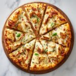Generously top your pizza with shredded mozzarella for that classic gooey cheesiness, and sprinkle cheddar cheese on if you like a sharper, tangier twist. This melty combination is what makes the pizza irresistibly creamy and rich.