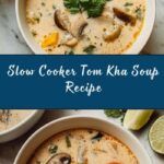 This Slow Cooker Tom Kha Soup is a rich and fragrant Thai coconut chicken soup slow-cooked to tender perfection. Featuring creamy coconut milk, aromatic lemongrass, galangal, and kaffir lime leaves, this comforting soup combines savory, tangy, and subtly spicy flavors with tender chicken thighs and mushrooms, making it an effortless and delicious meal perfect for any day.